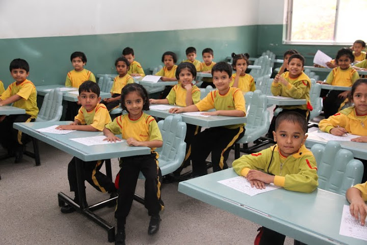 The students also have individual seats. Each student is given a pencil box which holds the necessary stationery. There are cubby holes for textbooks, worksheets, geometry boxes, extra pencils, pens, rulers etc. There is a whiteboard and public address system in each class too.
